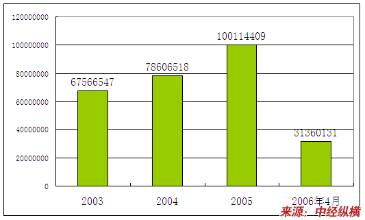 | 2006年1-4月 | 31360131 | 10535033 | 10846693 | 9981542 |