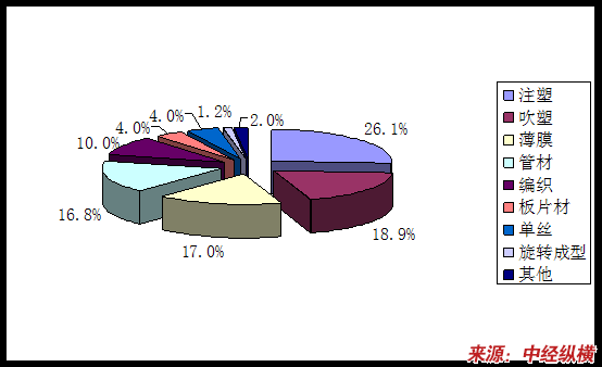 我国HDPE 的主要消费领域是注塑、吹塑、薄膜制品和管材,HDPE在注塑、吹塑、薄膜和管材方面消费呈增长趋势,编织、板材和拉丝料等的消费将减少,注塑制品仍为HDPE最大的消费领域,见下表。