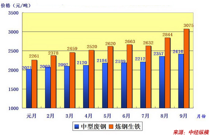 2007年1-9月份我国废钢铁市场呈小幅波动,持续上扬的态势。以中型废钢为例,2006年12月全国平均价格为1980元/吨,到2007年9月持续上涨到2416元/吨,上涨436元/吨,增长率为22%。增长幅度偏大。