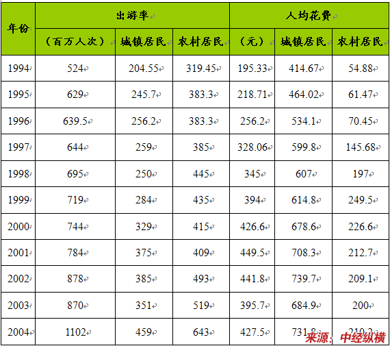 1994-2004年国内旅游人均花费及出游率