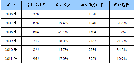 2006-2011年中国自行车链条原料冷轧钢带产量及同比增长