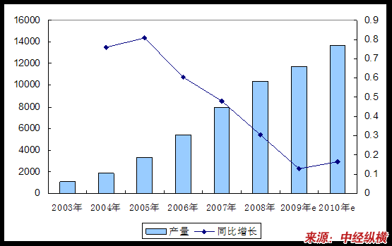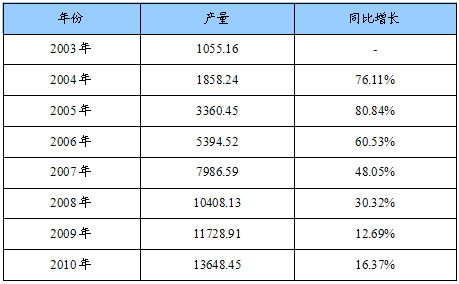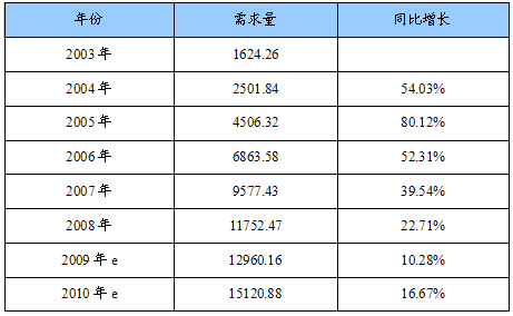 2003-2010年左旋肉碱市场需求量统计及预测表