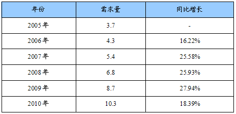 2005-2010年格拉辛纸需求量及同比增长统计表