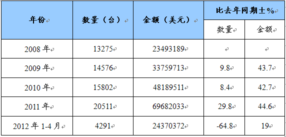 截止到2011年,我国种子、谷物或干豆的清洁、分选或分级机器进口量达到417台,同比减少8.1%;进口额达到1831万美元,同比增加16.5%。进入2012年,进口数量大幅增加,截止到4月底,进口数量达到201台,比去年同期增长164.5%,2008-2012年4月进口数据如下表所示: