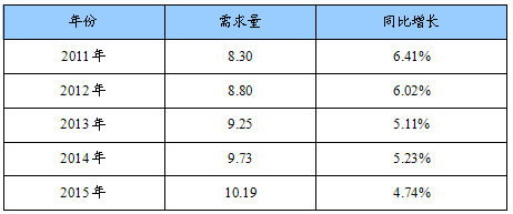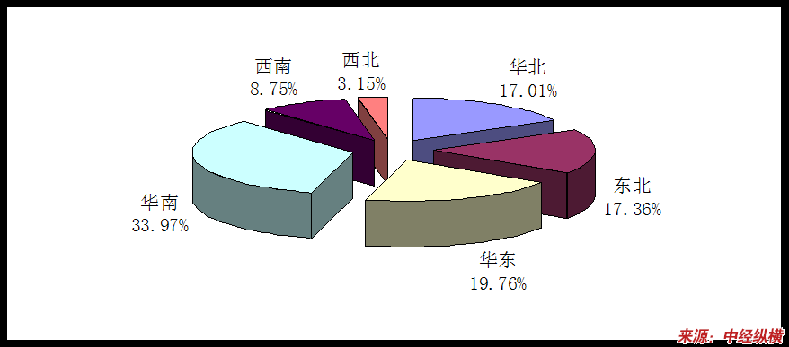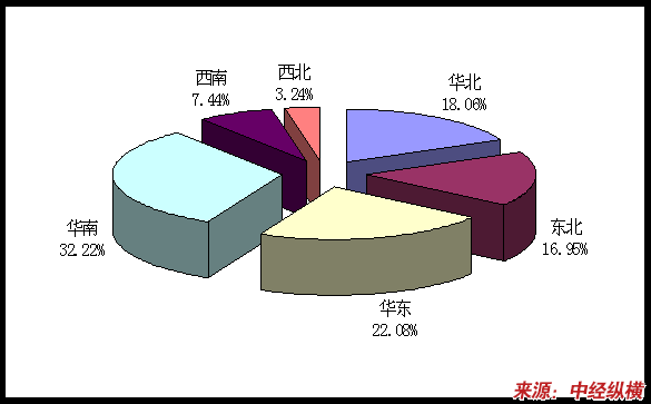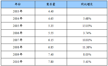 从2008年、2009年以及2010年的需求表现看,增速分别为11.38%、8.03%、5.41%,增速逐渐放缓。而市场分布主要集中在华南、华东以及华北地区,西南、西北地区则相对较少。