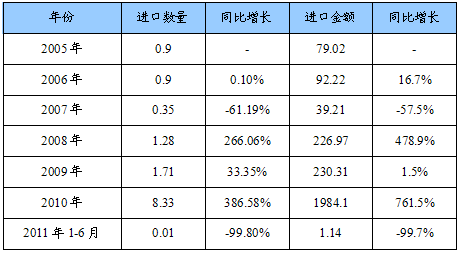 2005-2011年6月中国食用高粱进口数量及金额统计