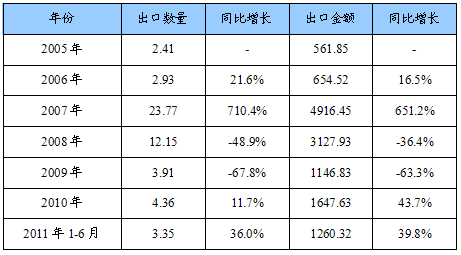 2005-2011年6月中国食用高粱出口数量及金额统计