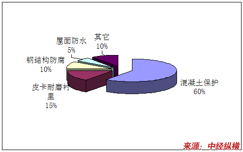 应用领域分布如下:混凝土保护占60%,皮卡耐磨衬里15%,钢结构防腐10%,屋面防水5%,其它10%。