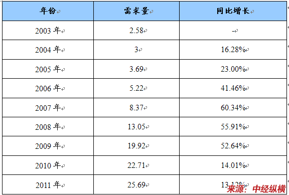 2003-2011年超细玻璃棉需求量及同比增长 单位:万吨