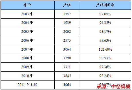 2003-2011年钢坯连铸机用结晶器产能及利用率