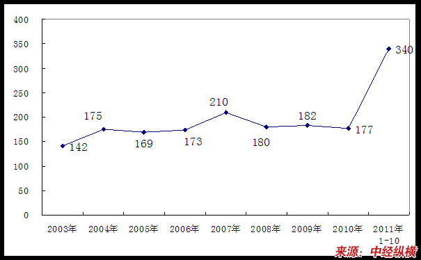 2003-2011年10月中国钢坯连铸机用结晶器市场均价走势