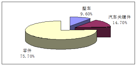 在我国汽车产品出口,零配件占9成以上。2004年全年,我国整车出口仅有7.79亿美元,而汽车关键件与零件的出口额分别达12、61.76亿美元,二者之和占汽车产品出口总额的90.4%。零部件业已成为我国汽车工业出口的支柱性产业。