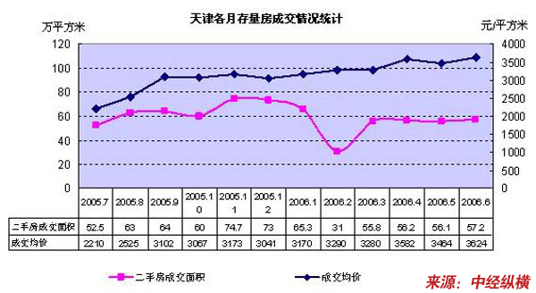 今年上半年,天津二手房成交面积为321.6万平方米,成交金额109.2亿元,同比面积减少30.3%,金额增长7.7%。上半年市区二手房成交量走低,同时郊县存量房市场尚不成熟,是造成今年上半年天津二手房成交量大幅下挫的原因。2006年上半年,天津二手房成交均价为3396元/平方米,同比去年增长54.6%,远远超过同期商品房成交增幅。二手房价格增速过快,也是造成天津存量房成交走低的重要原因。此外,受国六条政策影响,新的商品房交易契税也对天津三级市场造成较大冲击。但从长远来看,三级市场作为天津住房梯次消费的重要组成部分,还有很大发展空间。