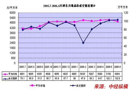据统计,今年上半年,天津商品房成交量为517.6万平方米,成交金额261.9亿元,同比增长6.1%和36.3%。成交均价为5059元/平方米,比去年同期上涨28.4%,与去年下半年相比增长9.1%。图为2005年7月份至2006年6月份天津各月商品房成交统计。从图中可知,今年上半年,天津商品房市场走势较为平稳。除2月份春节淡季外,其它月份均稳定在80万平方米的水平。考虑到上半年天津新上市项目较少,取得这一销量殊为不易。同时房价继续维持去年下半年以来的收敛性稳定特点。2006年6月份,受宏观调控政策影响,天津商品房成交量出现明显回落,市场观望气氛形成。6月份成交价格出现回落主要是受成交结构影响。今年6月份,天津郊县与市区商品住宅成交量之比接近2:1,郊县成交比重加大导致天津市平均房价下挫。