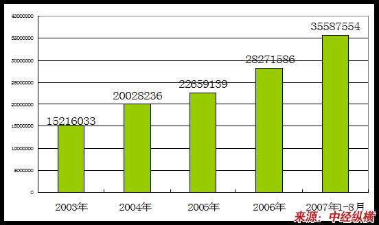 | 2007年1-8月 | 35587554 | 5470783 | 9883472 | 20233299 |