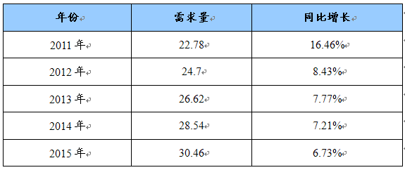 2011-2015年中国复合型吸波材料需求量预测 单位:万吨