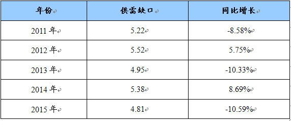 2011-2015年中国复合型吸波材料供需缺口预测 单位:万吨