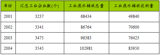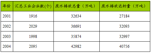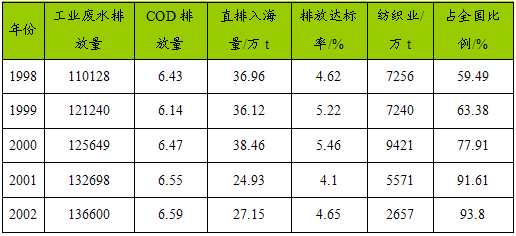 由表可以看出,从20世纪90年代中期开始,纺织 行业 废水排放总量一般都在11亿t以上,在国内各类工业废水排放量中约占6.5%,位于各 行业 废水排放量的前十位.COD排放量约为30万t,占全国工业排放量的5%左右.其中废水相当一部分还是采取直排入海的方式,排放达标率除2001和2002年有所提高外,在此之前一直很低.