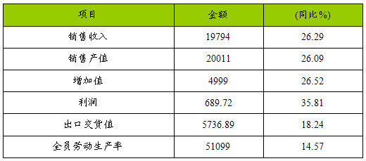 2005年规模以上纺织工业实现销售收入19794亿元,同比增长26.29%,增幅比去年提高了1个百分点;产销率达到为97.76%,同比增长0.15个百分点;销售产值20011.28亿元,同比增长26.09%,增幅上升了1.91个百分点;工业增加值4999.18亿元,同比增长26.52%,增幅上升了2.16个百分点;实现利润689.72亿元,同比增长35.81%,增幅上升了19.59个百分点;出口交货值5736.89亿元,同比增长了18.24%,增幅提高了1.1个百分点;销售产值增速高过出口交货值增速7.85个百分点,说明内需对纺织产业的拉动作用突出。