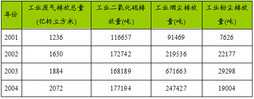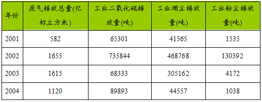 纺织 行业 的废气主要来自 行业 内的约两万台锅炉,这些锅炉总蒸汽容量约为6万t,其中烟尘排放达标的锅炉约占总数的85%.这些锅炉绝大多数以煤(包括一部分原煤)为燃料,这些煤含有一定量的硫,在燃烧过程中排放出大量的燃烧废气,二氧化硫和烟尘,严重污染了环境.表2是近几年纺织工业规模(年产值500万元以上)以上工业企业的废气排放情况.