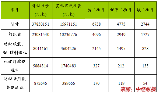 2005年纺织 行业 固定资产投资金额1597亿元(投资额500万元以上),同比增长35.5%,增幅提高了5.3个百分点;计划投资3785亿元,同比增长38.8%;施工项目数6738个,增加1463个;新开工项目4775个,增加1202个。
