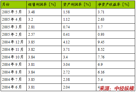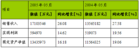 截止到2005年5月,塑料制品业 行业 的销售收入总额为17,103,546万元,与上一年同期相比增长26.08%。利润总额为594,970万元,同比增长14.62%。本期销售利润率由上一年同期的3.83%降低到3.48%。