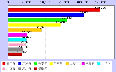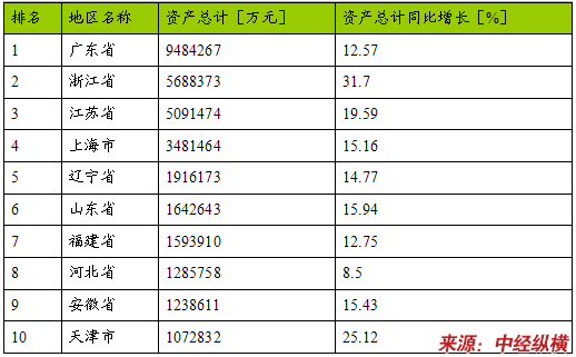 从 行业 资产地区分布情况看,排名前三位的分别是广东省、浙江省、江苏省,与上一年同期相比,资产总计增幅较大的是宁夏区、浙江省、四川省。