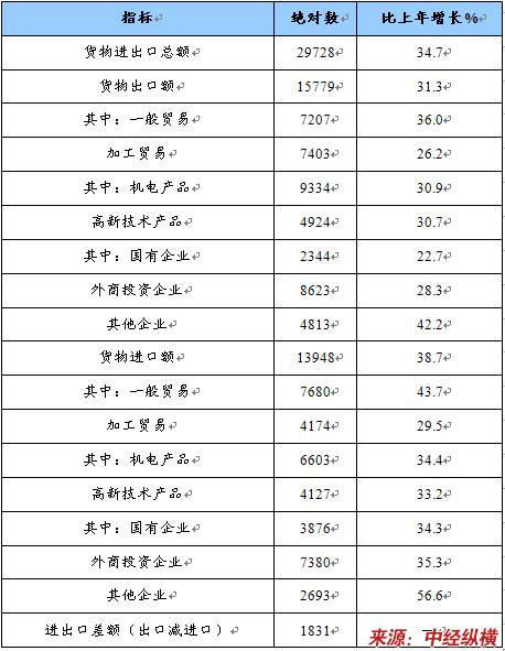 2010年全年货物进出口总额29728亿美元,比上年增长34.7%。其中,货物出口15779亿美元,增长31.3%;货物进口13948亿美元,增长38.7%。进出口差额(出口减进口)1831亿美元,比上年减少126亿美元。
