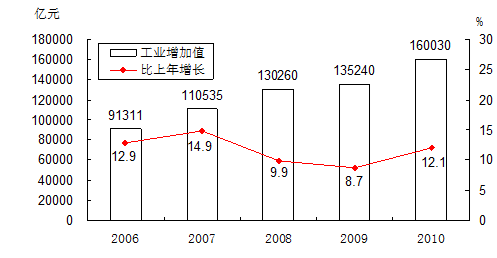 2010年全年全部工业增加值160030亿元,比上年增长12.1%。规模以上工业增加值增长15.7%。在规模以上工业中,国有及国有控股企业增长13.7%;集体企业增长9.4%,股份制企业增长16.8%,外商及港澳台商投资企业增长14.5%;私营企业增长20.0%。轻工业增长13.6%,重工业增长16.5%。