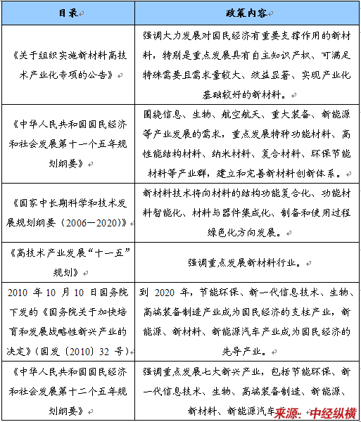 电子信息材料、新能源材料、纳米材料、先进复合材料、先进陶瓷材料、生态环境材料、新型功能材料(含高温超导材料、磁性材料、金刚石薄膜、功能高分子材料等)、生物医用材料、高性能结构材料、智能材料、新型建筑及化工新材料等。烧结钕铁硼永磁材料作为磁性材料中重要产品,属重点新材料,得到了国家相关 产业政策 的大力扶持。具体情况如下: