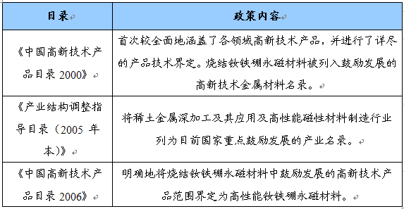 钕铁硼永磁材料作为重点高新技术产品,得到了国家众多 产业政策 的扶持,具体情况如下: