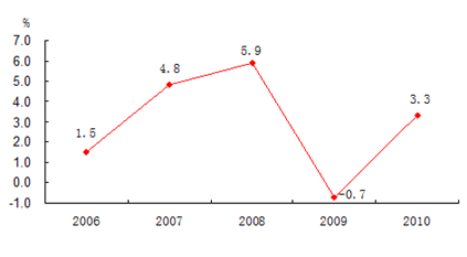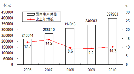 初步核算,2010年全年国内生产总值397983亿元,比上年增长10.3%。其中,第一产业增加值40497亿元,增长4.3%;第二产业增加值186481亿元,增长12.2%;第三产业增加值171005亿元,增长9.5%。第一产业增加值占国内生产总值的比重为10.2%,第二产业增加值比重为46.8%,第三产业增加值比重为43.0%。
