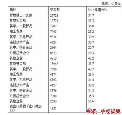 2010年全年货物进出口总额29728亿美元,比上年增长34.7%。其中,货物出口15779亿美元,增长31.3%;货物进口13948亿美元,增长38.7%。进出口差额(出口减进口)1831亿美元,比上年减少126亿美元。