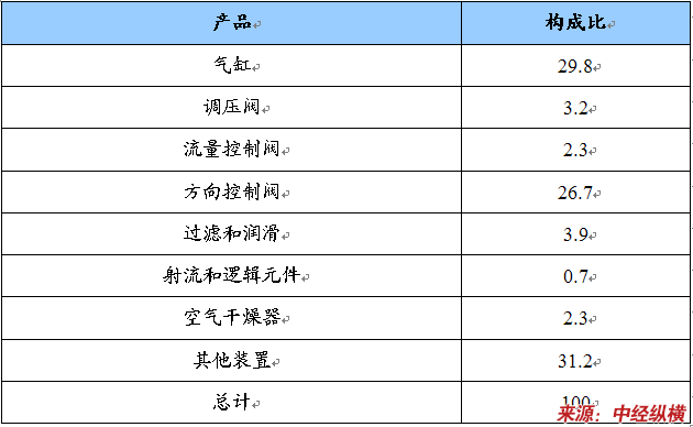 6、气动元件构成比变化不大,方向控制阀占总销售额的26.7%,气缸占29.8%。