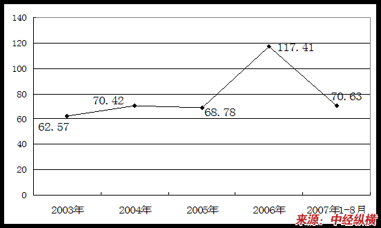2003年-2007年1至8月合成材料制造业负债率最好水平
