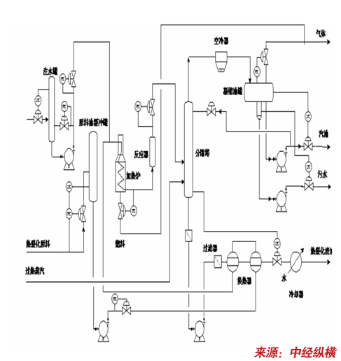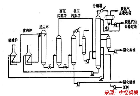 热裂化是以常压重油、减压馏分油和焦化蜡油等为原料,在高温(450~550度)和高压(2~5.0MPa)下裂化生成裂化汽油、裂化气、裂化柴油和柴油。