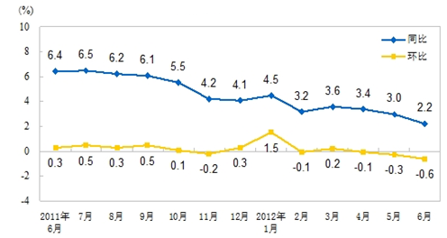 2012年上半年,居民消费价格同比上涨3.3%,涨幅比一季度回落0.5个百分点,比上年同期回落2.1个百分点。其中,城市上涨3.3%,农村上涨3.3%。