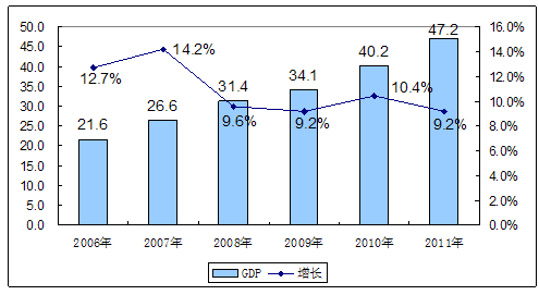 初步核算,2011年全年国内生产总值471564亿元,比上年增长9.2%。其中,第一产业增加值47712亿元,增长4.5%;第二产业增加值220592亿元,增长10.6%;第三产业增加值203260亿元,增长8.9%。第一产业增加值占国内生产总值的比重为10.1%,第二产业增加值比重为46.8%,第三产业增加值比重为43.1%。