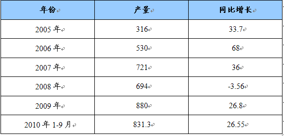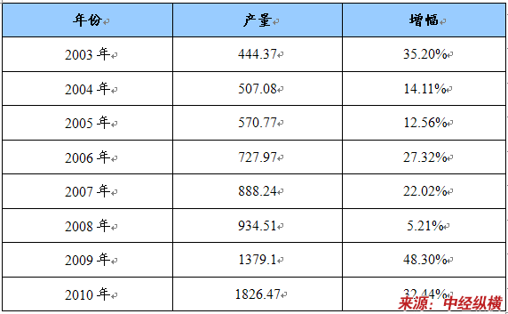 2003年-2010年钢材产量及增幅统计表 单位:万吨