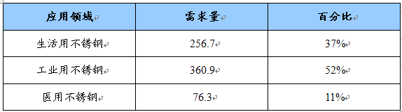 发达国家工业设施采用的不锈钢比例一般可到15%-20%,目前国内的应用比例还很小。这一方面是因成套引进的工业设备,不锈钢材料并未统计,另一方面是因国内材料尚未采用。化工、石化、化纤、造纸、食品、医药、能源(核电、火电、燃料电池)等领域都需要不锈钢。此外,现有进口设备已进入检修期。随着国产不锈钢产品质量的提高及特殊牌号产品的开发,今后国内工业设施方面不锈钢的应用将会逐年增加。