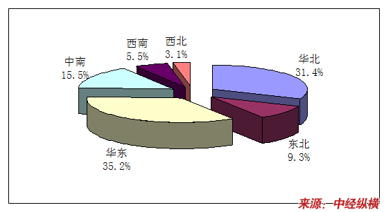 2008年我国钢材生产地区分布情况