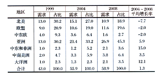 2008年各地区消费所占比重中,东亚、东南亚和南亚占45.3%。