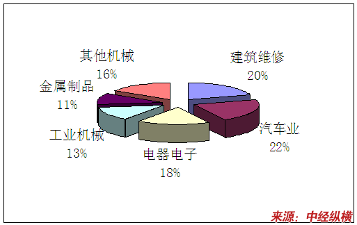 生产这么多紧固件都用在什么地方?首先汽车工业是最大的用户,占紧固件总销量的23.2%;第二个是维修工业市场和建筑工业,加起来占20%;第三个是电子工业占16.6%。