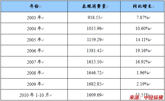 2003-2010年10月我国烧碱产品需求量及同比增长统计表 单位:万吨