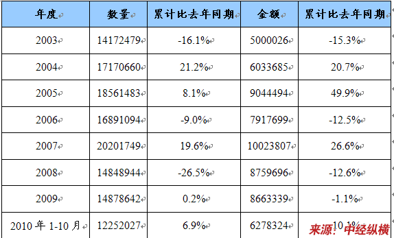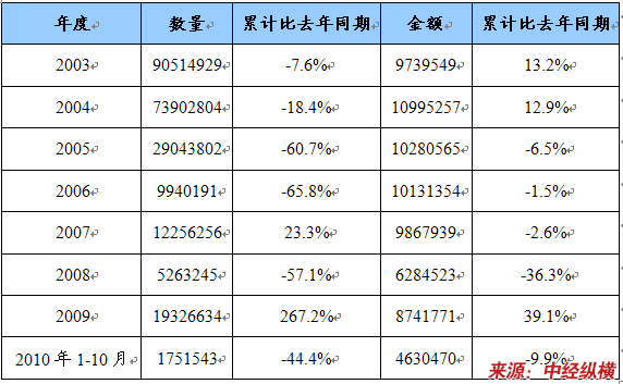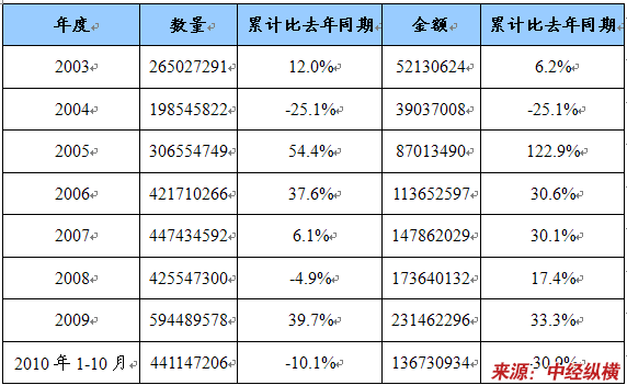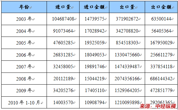 2003-2010年10月我国烧碱产品进出口量及同比增长统计表 单位:千克;美元