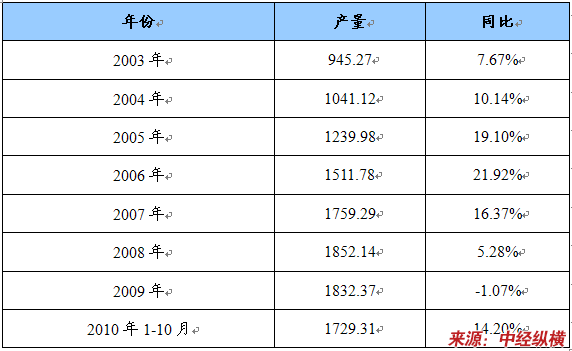 2003-2010年10月我国烧碱产品产量及同比增长统计表 单位:万吨