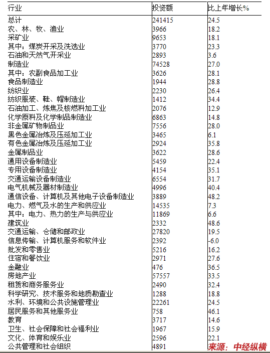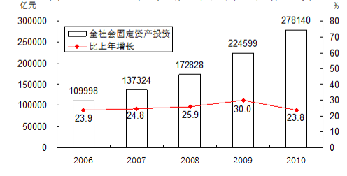 全年全社会固定资产投资278140亿元,比上年增长23.8%,扣除价格因素,实际增长19.5%。其中,城镇投资241415亿元,增长24.5%;农村投资36725亿元,增长19.7%。东部地区投资[6]115970亿元,比上年增长21.4%;中部地区投资62894亿元,增长26.2%;西部地区投资61875亿元,增长24.5%;东北地区投资30726亿元,增长29.5%。