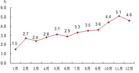 居民消费价格一季度同比上涨2.2%,二季度上涨2.9%,三季度上涨3.5%,四季度上涨4.7%,全年平均比上年上涨3.3%,其中食品价格上涨7.2%。固定资产投资价格上涨3.6%。工业品出厂价格上涨5.5%。原材料、燃料、动力购进价格上涨9.6%。农产品生产价格上涨10.9%。