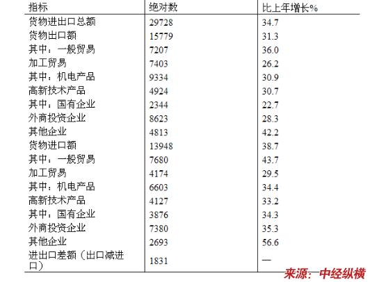 2010年年货物进出口总额29728亿美元,比上年增长34.7%。其中,货物出口15779亿美元,增长31.3%;货物进口13948亿美元,增长38.7%。进出口差额(出口减进口)1831亿美元,比上年减少126亿美元。
