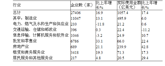 2010年非金融领域新批外商直接投资企业27406家,比上年增长16.9%。实际使用外商直接投资金额1057亿美元,增长17.4%。